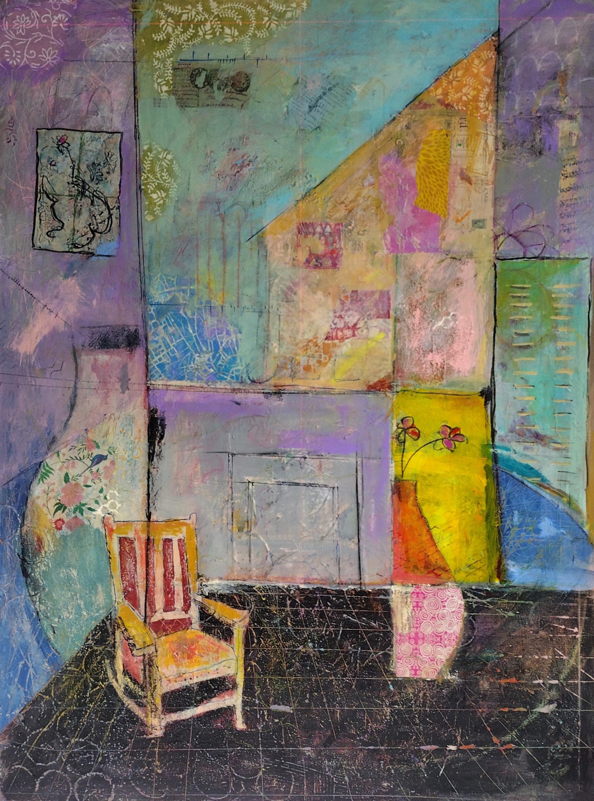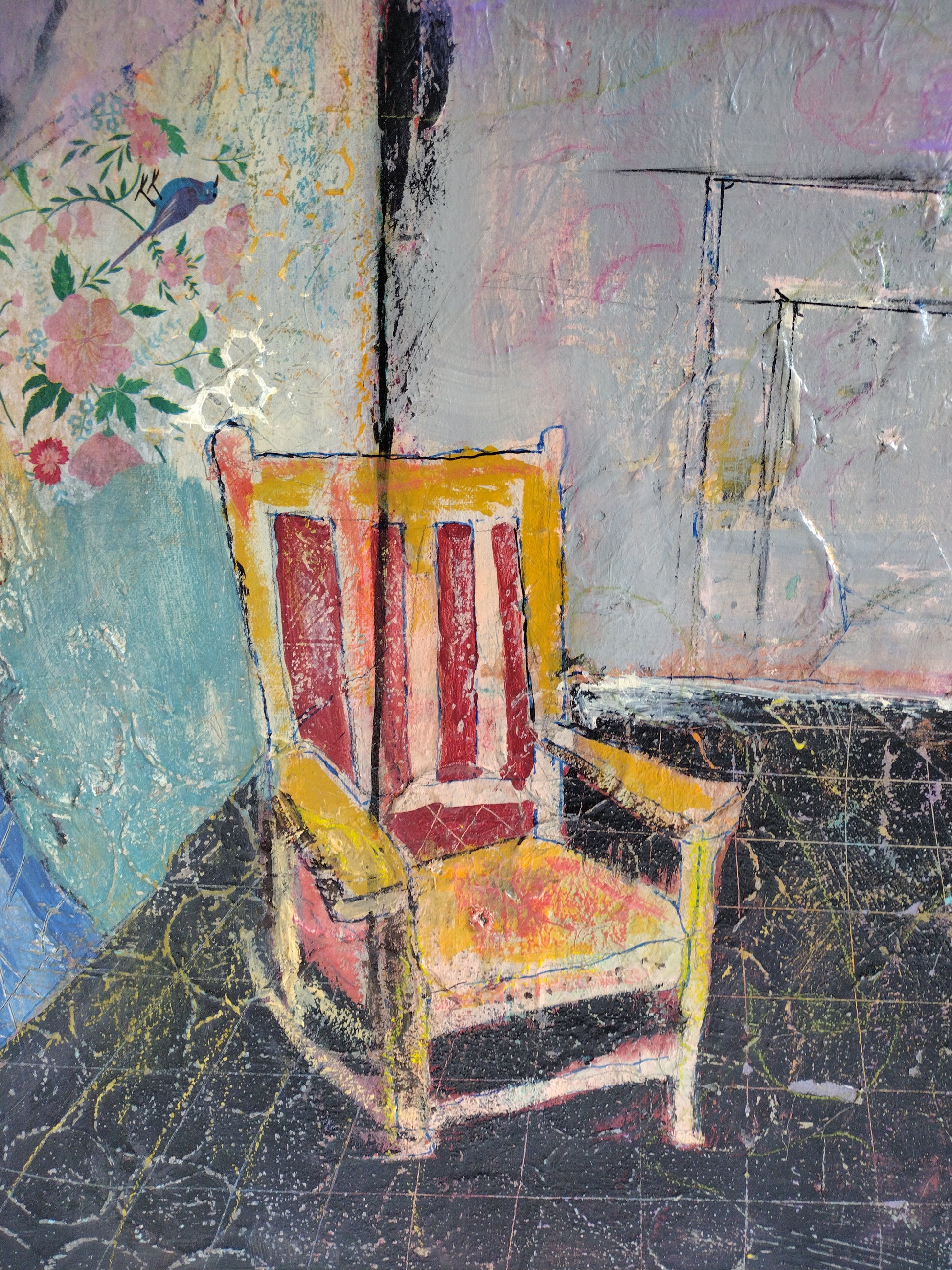The inspiration for this work came from the artist's experience at an estate sale, which is often a sad and somber occasion. The sale was held in an older home, filled with boxes of old postcards, handwritten recipes stuck on the refrigerator, and an old Stickley chair, among other objects. The artist's surreal experience and imagination of what this house would have been once upon a time is beautifully captured in this painting.