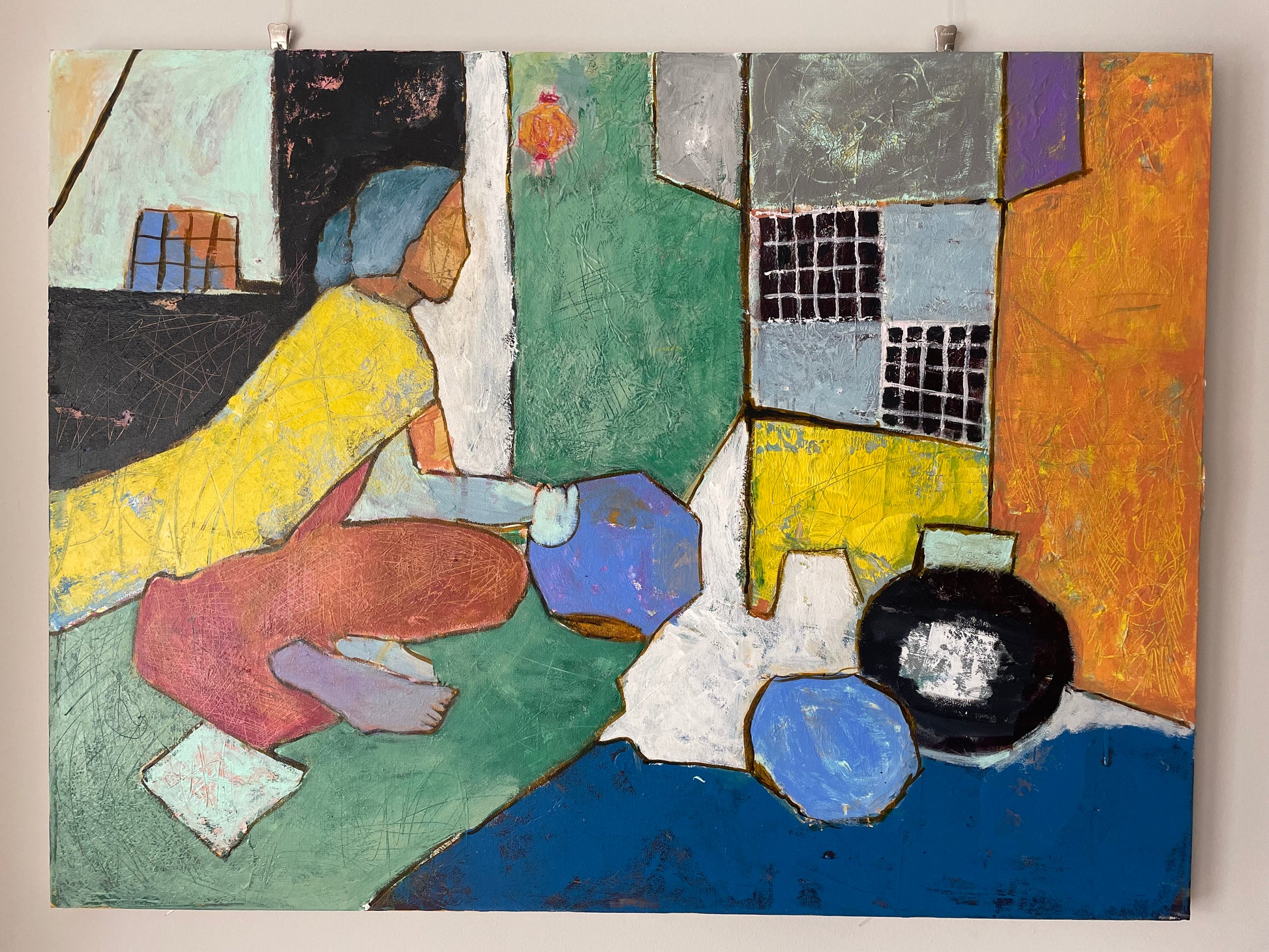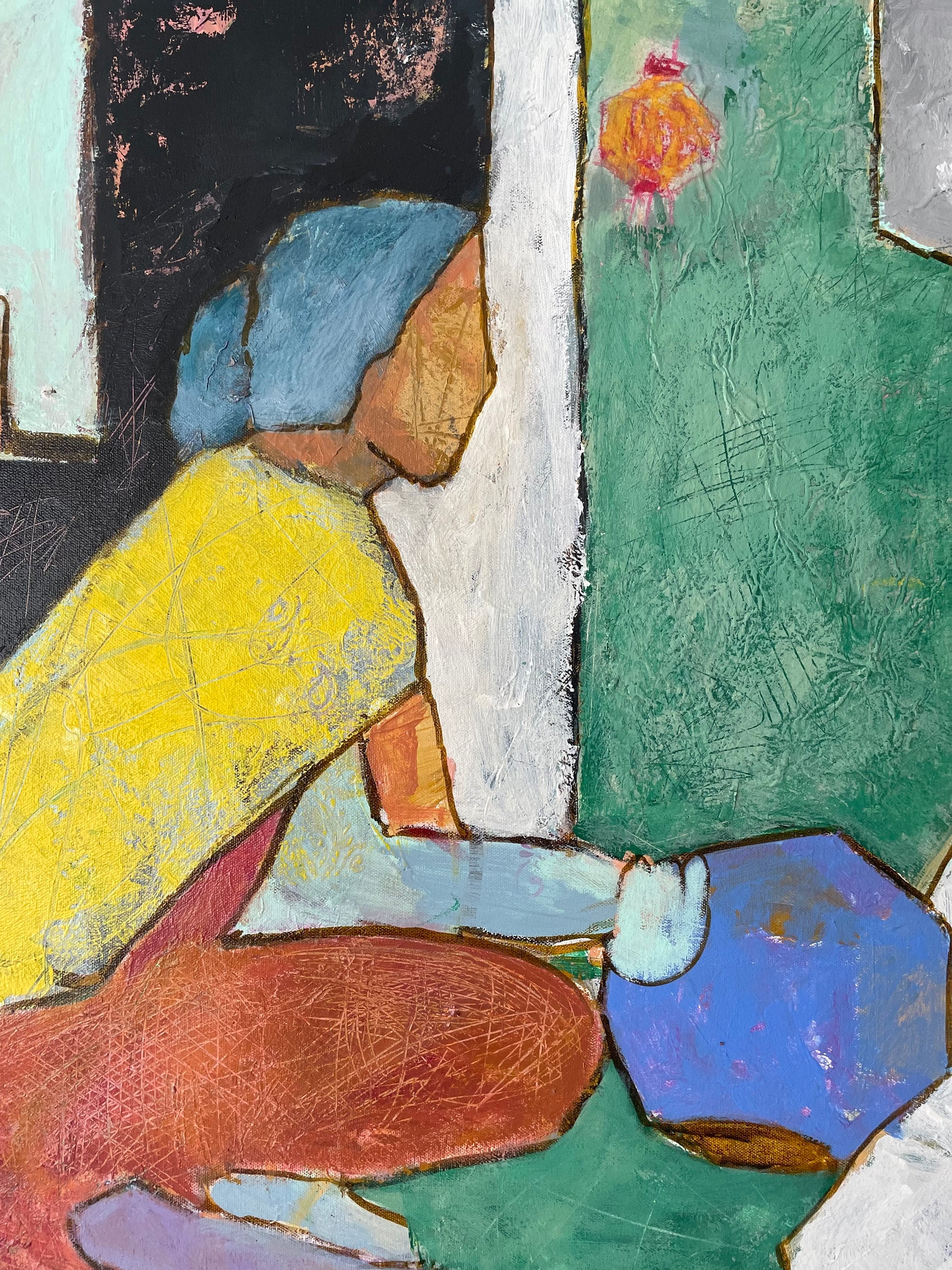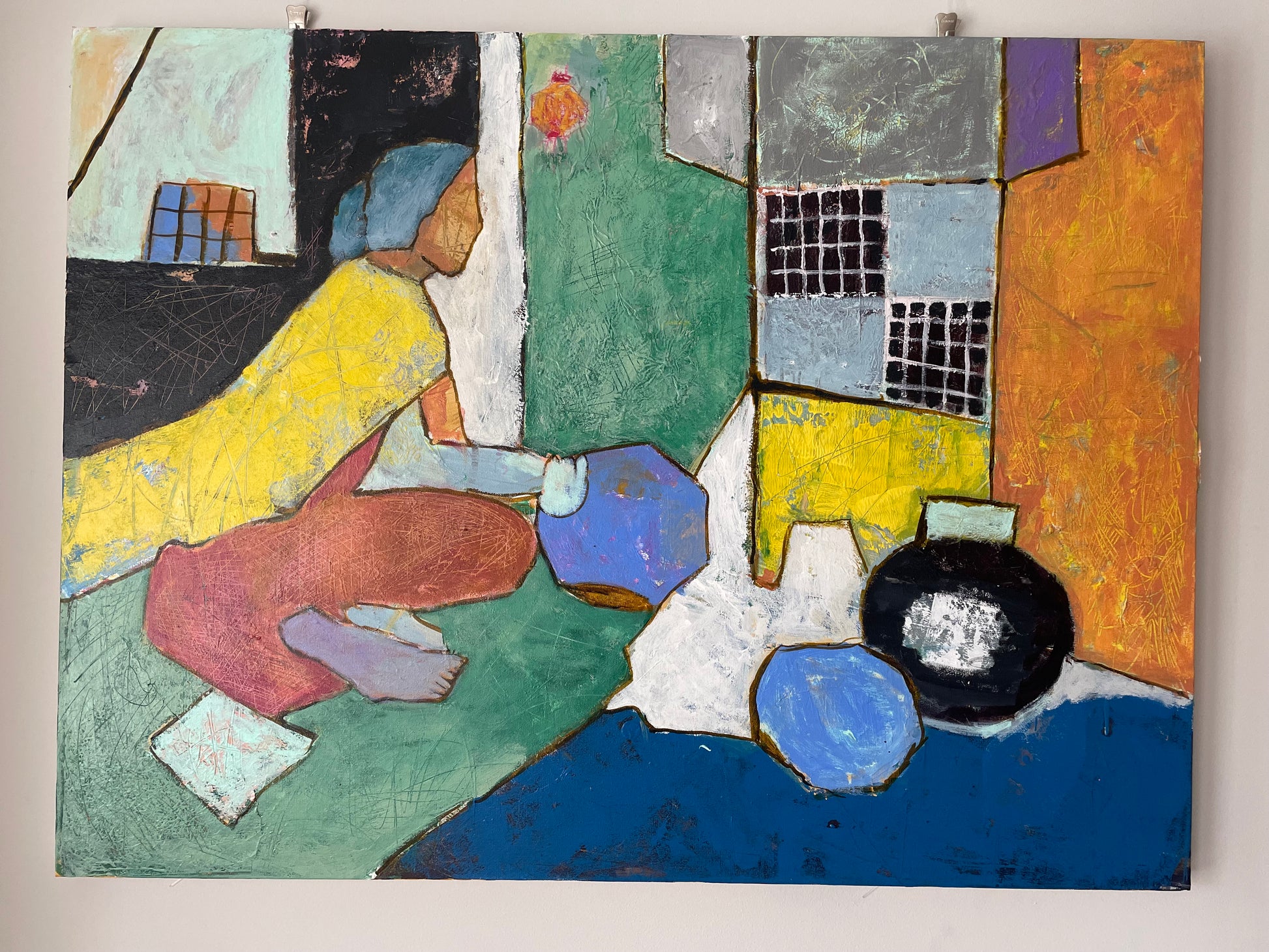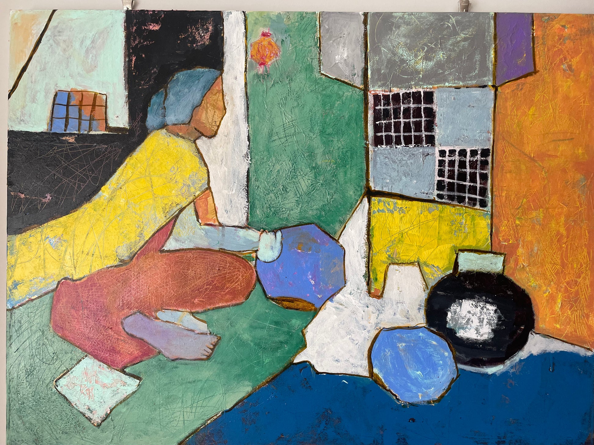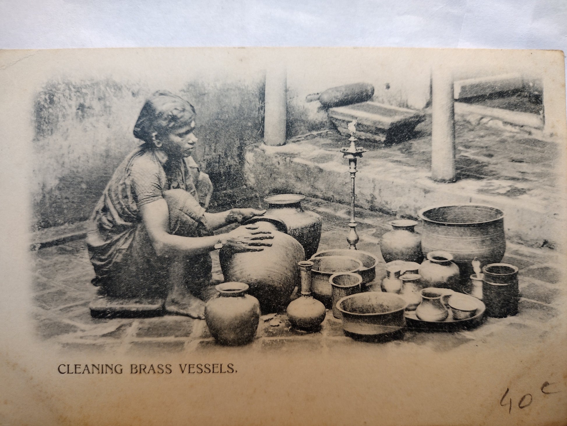 This mixed media artwork is a reconstruction of an antique postcard that was discovered in one of Paris's secret passages. (see embedded vlog). The piece brings to life a 19th century image of a cleaning lady in colonial India, infused with vibrant mixed media colors.