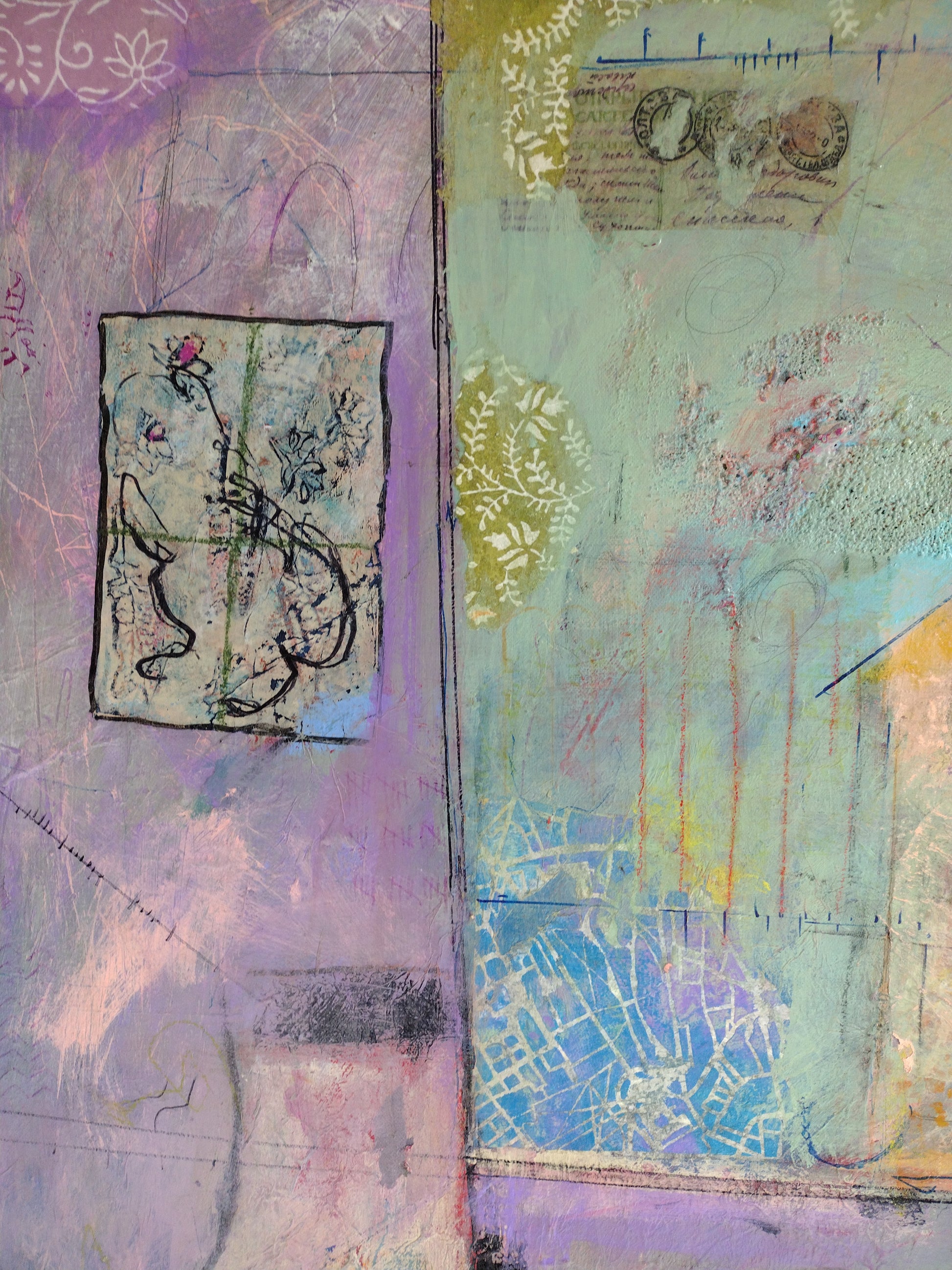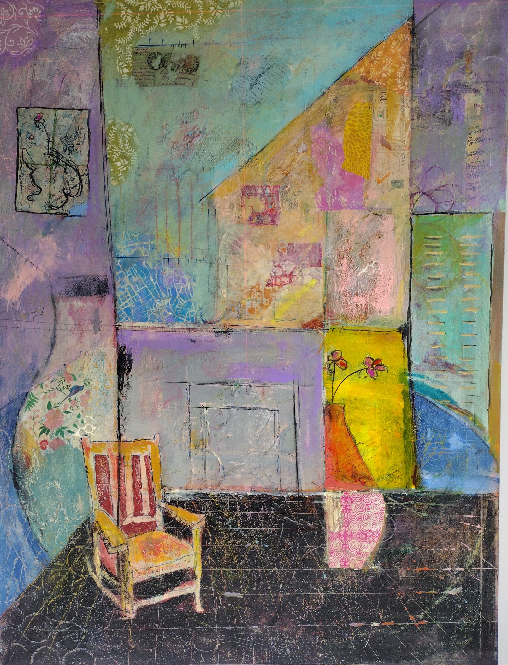 The inspiration for this work came from the artist's experience at an estate sale, which is often a sad and somber occasion. The sale was held in an older home, filled with boxes of old postcards, handwritten recipes stuck on the refrigerator, and an old Stickley chair, among other objects. The artist's surreal experience and imagination of what this house would have been once upon a time is beautifully captured in this painting.